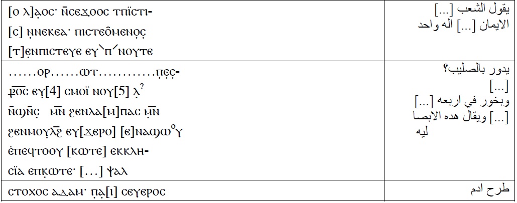 The next frame includes a liturgical instruction, the deciphering of which turned out to be a very challenging task. In spite of our efforts, and the use of the tools at our disposal in the BAV, we were not able to identify every letter on all lines. Nevertheless, we made a significant step forward. We read many and reconstructed plausibly most of the letters. As a result, four elements could be singled out. (1) Despite the fact that the first line of the liturgical instruction is completely illegible, it most probably informs us of what should happen to the Cross at the end of the first Hour of the Day of Holy Saturday. Maybe the Cross was to be lifted by the priest? (2) We guess that the third line includes the Coptic word for “linen or silk”. Should there be an object (Cross or icon) wrapped in silk or linen? The censers are clearly legible in the Arabic counterpart but not to be found in the Coptic text. (3) Many lighted lamps and candles were most probably carried around. (4) Something had to be done in the church four times. The first thing that comes to mind is the procession round the church. However, we know that the priest goes in procession “thrice round the church” [5] at that hour and not four times. The number ‘four’ is clearly legible as much in Coptic as in Arabic. Does the number ‘four’ refer to the four cardinal points and not to the procession round the church? As one can see, we still have a few questions to be answered regarding the liturgical instruction.