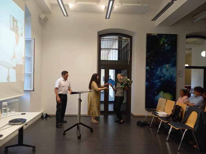 Just before Anne Boud’hors gave her impressive evening lecture “Die Macht Gottes und die Milde des Propheten”, on the policy of quoting the books of the prophets in Coptic Literature, Diliana Atanassova and Frank Feder surprised Heike Behlmer with her birthday present, a copy of her Festschrift entitled: Pharaonen, Mönche und Gelehrte, comprising more than 1000 pages with articles by 58 contributors.