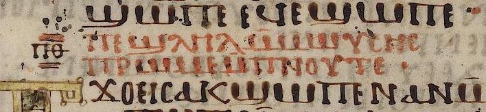 [2] Schüssler erwähnt die Benutzung der Überstriche folgendermaßen: „Überstrich regelmäßig, bei nomina sacra in Rot.“, vgl. Schüssler, Bibilia Coptica 1.2, 54. Allerdings sollte klargestellt werden, dass es in den bekannten Blättern insgesamt 20 Vorkommnisse von Wörtern mit roten Überstrichen gibt und nur zwei davon können als nomina sacra bezeichnet werden: ⲡⲛ̄ⲁ (4 Mal) und ⲡ̄ⲓ̄ⲏ̄ⲗ (3 Mal). Es ist nicht sicher, dass jedes nomen sacrum in dieser Handschrift mit einem schwarz-roten Überstrich gezeichnet wurde, zumal es ein ⲡⲛ̄ⲁ (Ps 142,10 in Paris, BnF, Copte 129.2 f. 89r) ohne dies gibt.