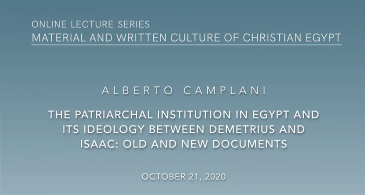 Alberto Camplani's recent lecture The Patriarchal Institution in Egypt and its Ideology between Demetrius and Isaac: Old and New Documents is now available on our YouTube channel. We like to thank Alberto, who was the first speaker in our Online Lecture Series Material and Written Culture of Christian Egypt, for giving us permission to record his presentation.