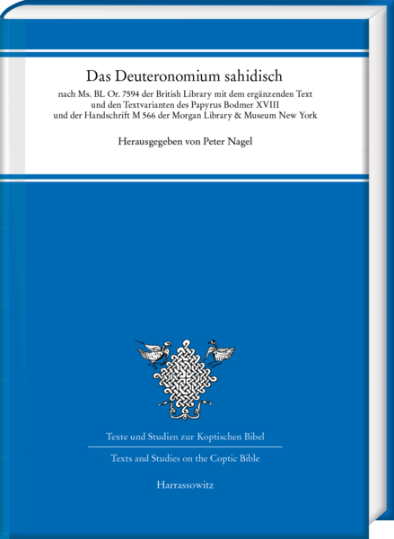 Volume 2 in the TSKB (Texts and Sudies on the Coptic Bible) series has just been published with Harrassowitz. Peter Nagel, a nestor in Coptic Studies and one of the best specialists in the research on the Coptic Bible, presents a new edition of the text of Deuteronomy in the early papyrus (4th century) British Library Or. 7594 (sa 17) with a miscellany of Biblical (Deut, Jonah, Acts) and apocryphal texts (Apocalypse of Elijah). The Deuteronomy text is one of the earliest witnesses of the Sahidic Old Testament and its grammar and syntax patterns yield very important examples of an early classical Sahidic. The first edition of the Deutoronomy text in Or. 7594 by Ernest A.W. Budge in 1912 (Coptic Biblical Texts in the Dialect of Upper Egypt) rendered this important document only very inadequately. Finally, Peter Nagel offers an exemplary and reliable edition critically checked, and supplied where the text of the London papyrus is missing, with textual variants of another fourth century papyrus P. Bodmer XVIII (sa 2001) and the complete medieval (9th–10th century) parchment manuscript M 566 (sa 2006). The edition is introduced by a codicological description and a short evaluation of its text character as version of the Septuagint. The text edition is accompanied by a complete translation and explanatory notes. The comprehensive indices explore the Coptic conjugation patterns, the Coptic vocabulary, the Greek loanwords, and the proper names in the text.