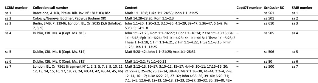 Updates to LCBM will appear on an annual basis (or more often if substantial changes occur). The published list is a fixed actual state (version 1.0, March 2021) of a work in progress representing the reconstruction of Coptic biblical and liturgical manuscripts, first for the Sahidic manuscripts. It gives the basic information for each manuscript, of which leaves or fragments in which collections it consists and which verses of a certain biblical book or pericopae they contain, and a concordance of the different numbering systems that exist. In addition, as for the NT manuscripts, also the Horner and GA sigla are noted. Any other detail, like provenance or dating, will be reserved for the comprehensive description of the manuscript in the metadata scheme in the manuscript catalogue. A link at the end of each line leads you, in case of the OT manuscripts, to the diplomatic editions in the CoptOT VMR, also work in progress and, therefore, in different stages of accomplishment, and, in case of the NT manuscripts, to the SMR-Database. For this first version, the column with 'codex type/lectionary type' is mostly left blank, as we are still working with the assignment of the fragments. This, and also the sigla for the manuscripts of the other dialects (except the classical Bohairic version which needs a separate list) will be added successively.